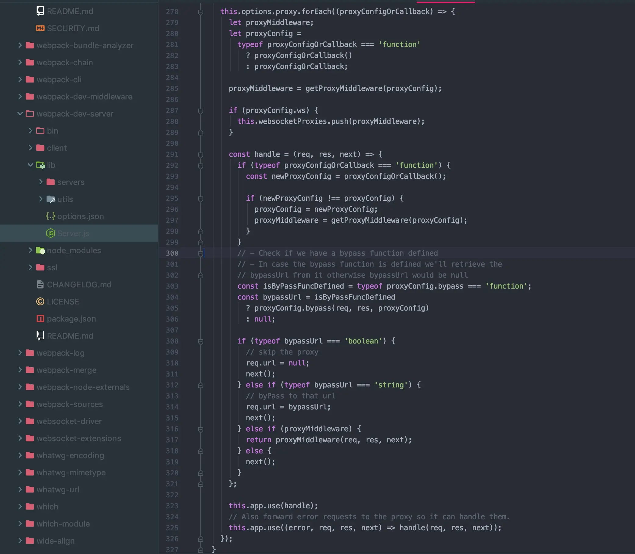 在webpack-dev-server的 class Server中可以找到对proxy的处理