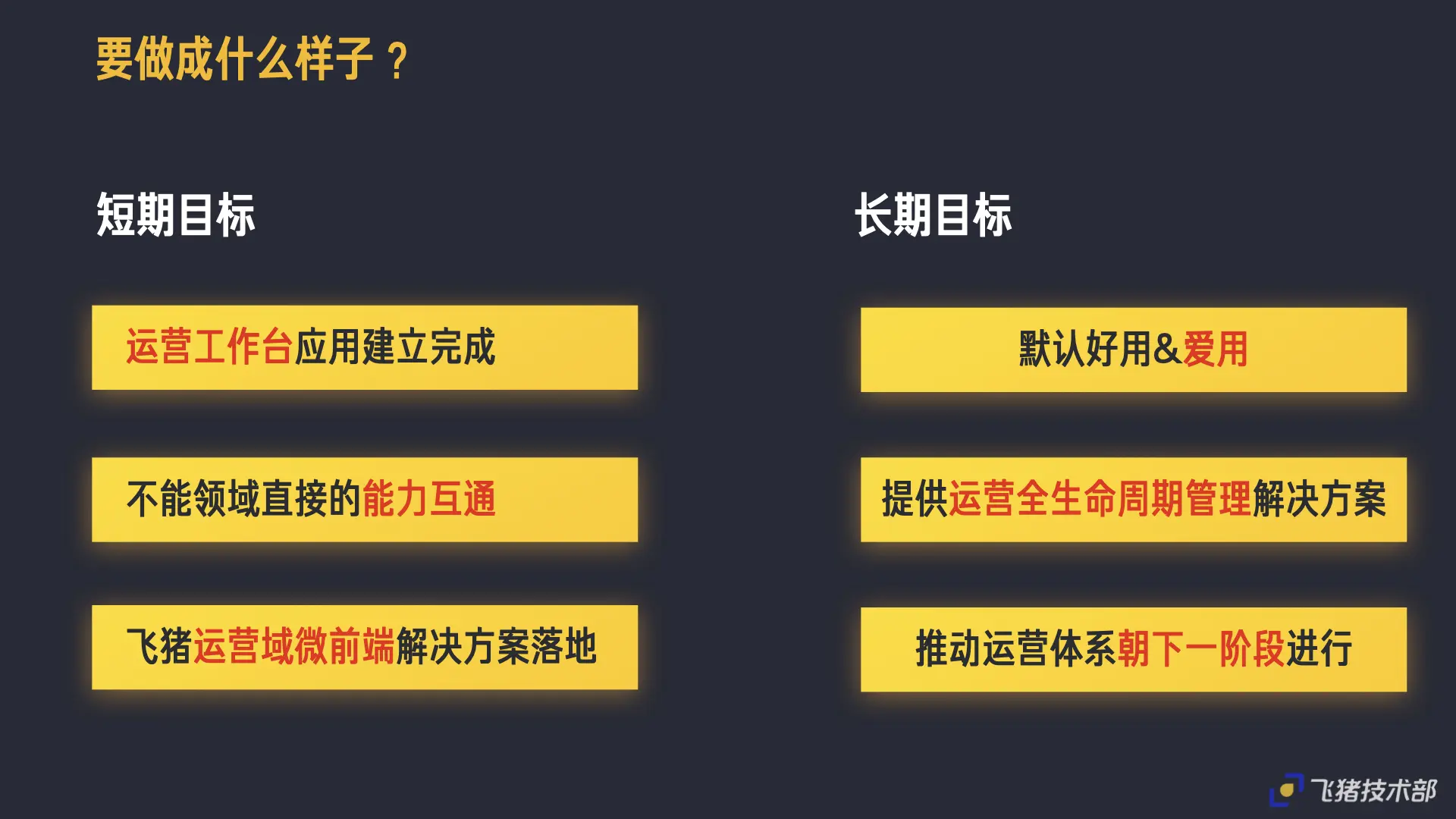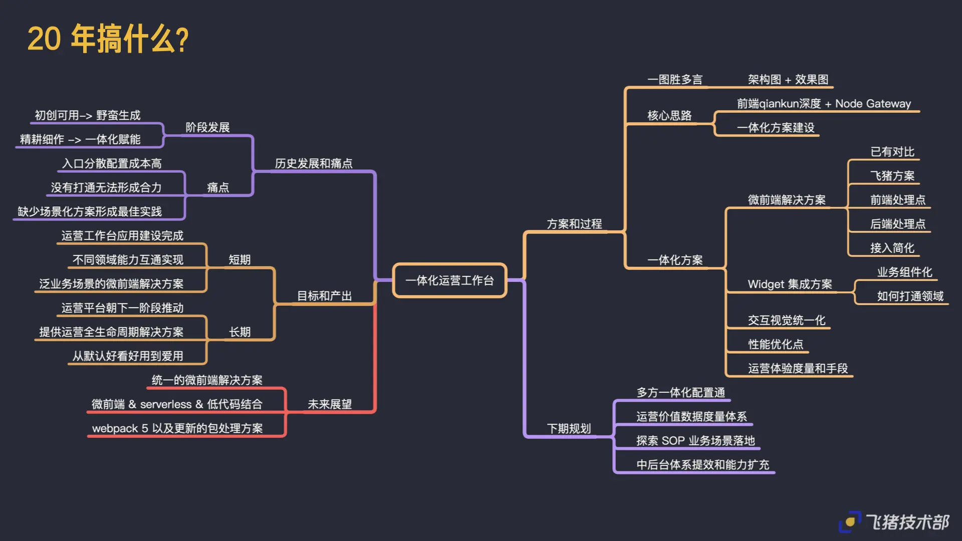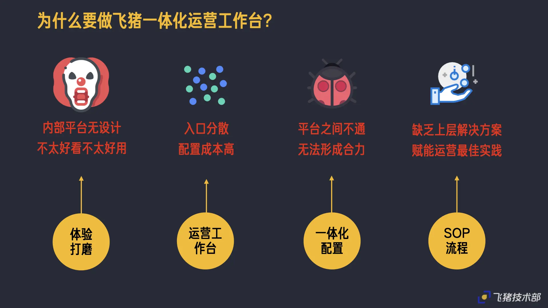 将从「为什么要做飞猪一体化运营工作台、要做成什么样子、怎么做的、后面想怎么做」这4块来给大家讲述。