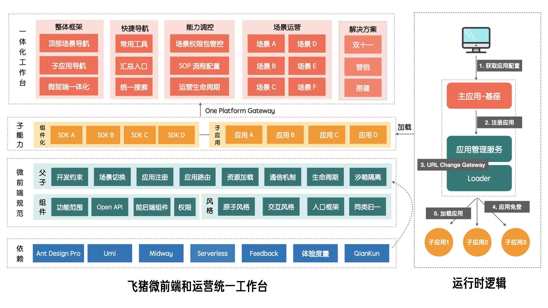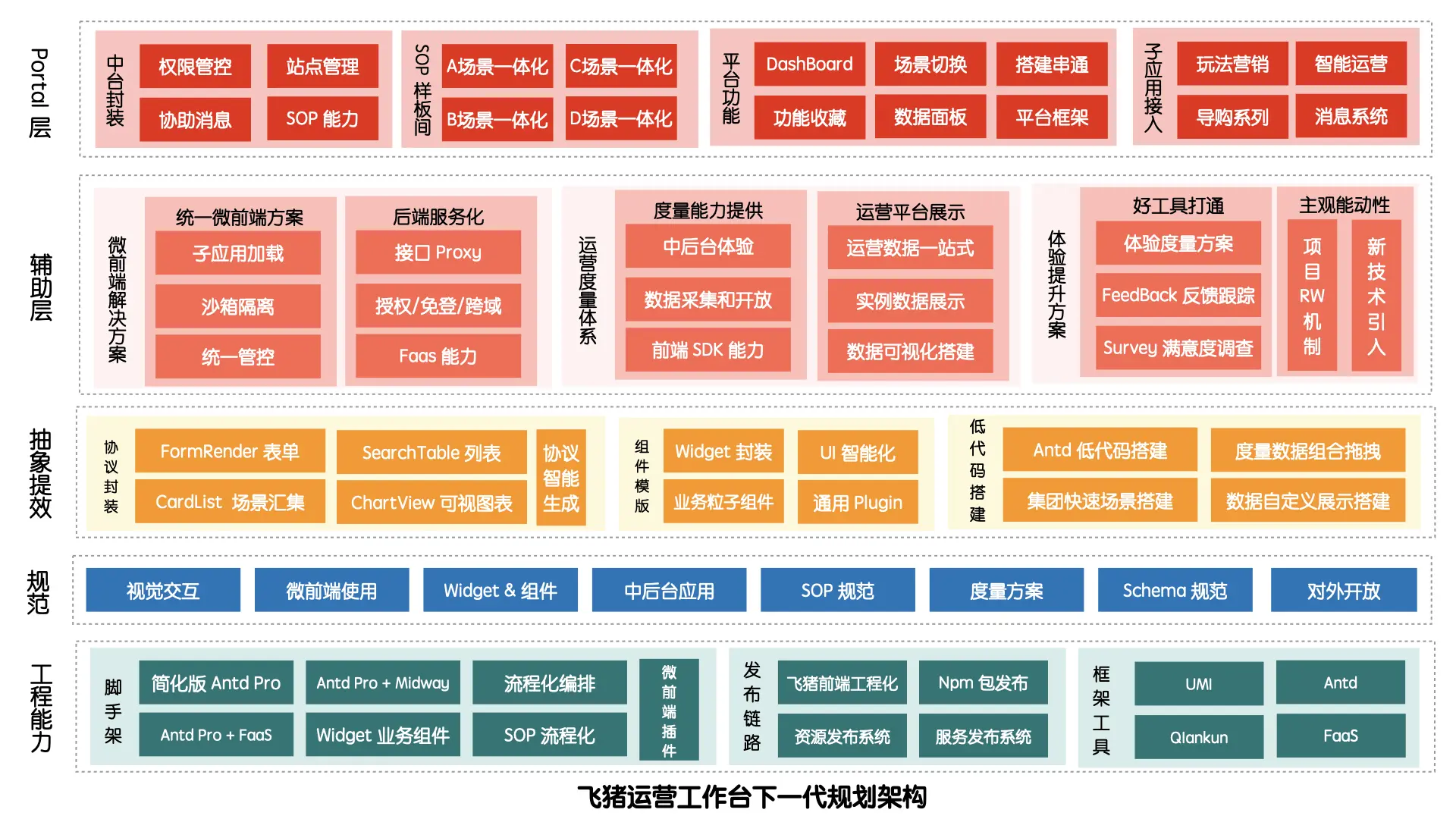 底层借助Ant Design 体系加上 qiankun 的能力,中间层辅助一体化工作台里面涉及的贴合现有业务场景的规范;更上一层沉淀组件化widget的能力,用于各种功能的互通,同时成为现有子应用的组合来源;在最上层即飞猪运营工作台的上层主应用,包括整体框架、快捷导航、权限登录控制、运营场景的汇集,包括后续要做的业务运营SOP解决方案。