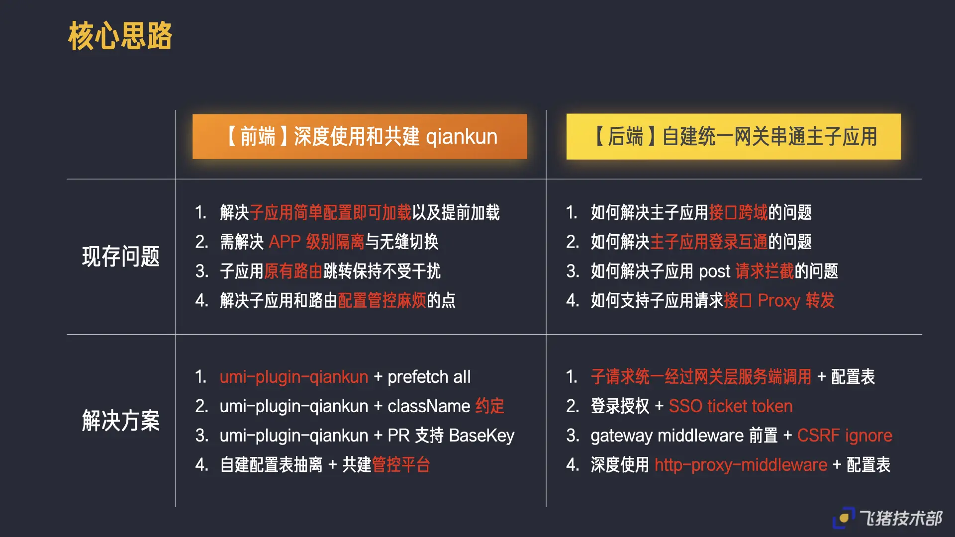 在前端侧,我们深度使用和更共建qiankun,qiankun 底层应⽤之间的加载使⽤ single-spa,上层实现样式隔离、js 沙箱、预加载等上层能⼒,同时提供umi-plugin-qiankun来解决 umi 下的快速使用,成为我们前端侧的选择方案。