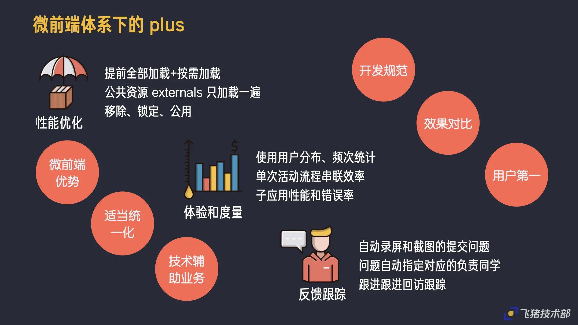 前端侧除了微前端还有路由这一块,其实还包括可以做的更多的事情,包括我们整合了公共资源如antd、loadsh、router等等统一大版本,通过写了umi-externals-url进行处理,借此可以减少将近1/3的资源;包括在体验度量方面我们借助内部的能力,可以将使用用户进行分层分析包括错误性能监控;同时产出具备可以录屏、截图的在线反馈系统,便于用于在使用过程中直接反馈通知直接issue提交给对应的负责同学;
