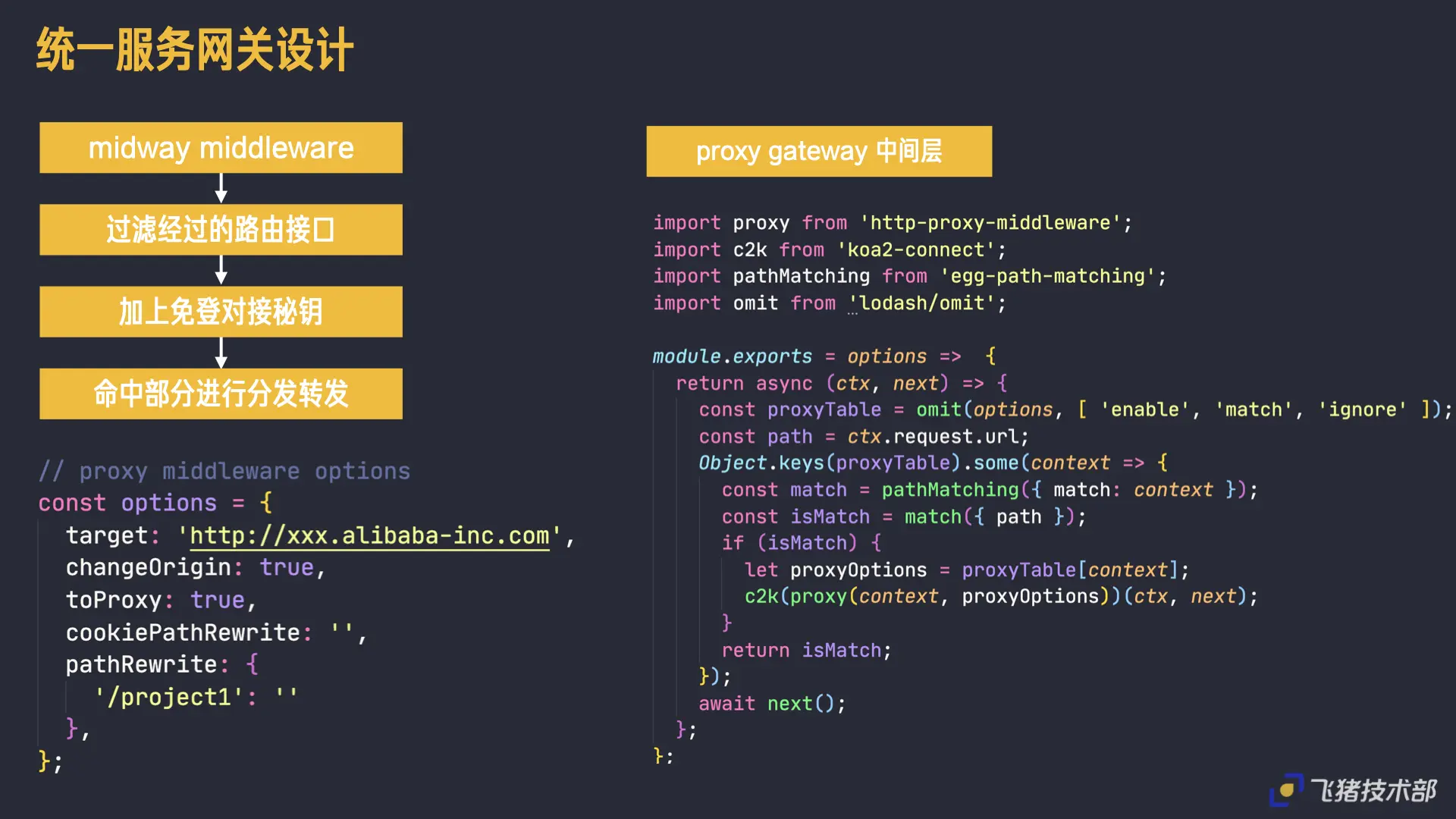 在后端侧,我们在运营工作台 Node 侧自建了 Gateway 网关 middleware,底层依赖http-proxy-middleware能力实现,借用服务端 proxy 转发接口同时在请求上加上 token 来解决接口登录权限以及跨域的问题,同时对于主子应用直接接入会出现内网登录登录权限不通的问题,此处我们使用的 免登授权 的能力,让子应用的登录让主应用本身来提供,这样通过中间网关层配合我们给 qiankun pr 的 Fetch 自定义能力和 Slave Namebase 可解决请求和路由跳转的兼容问题。