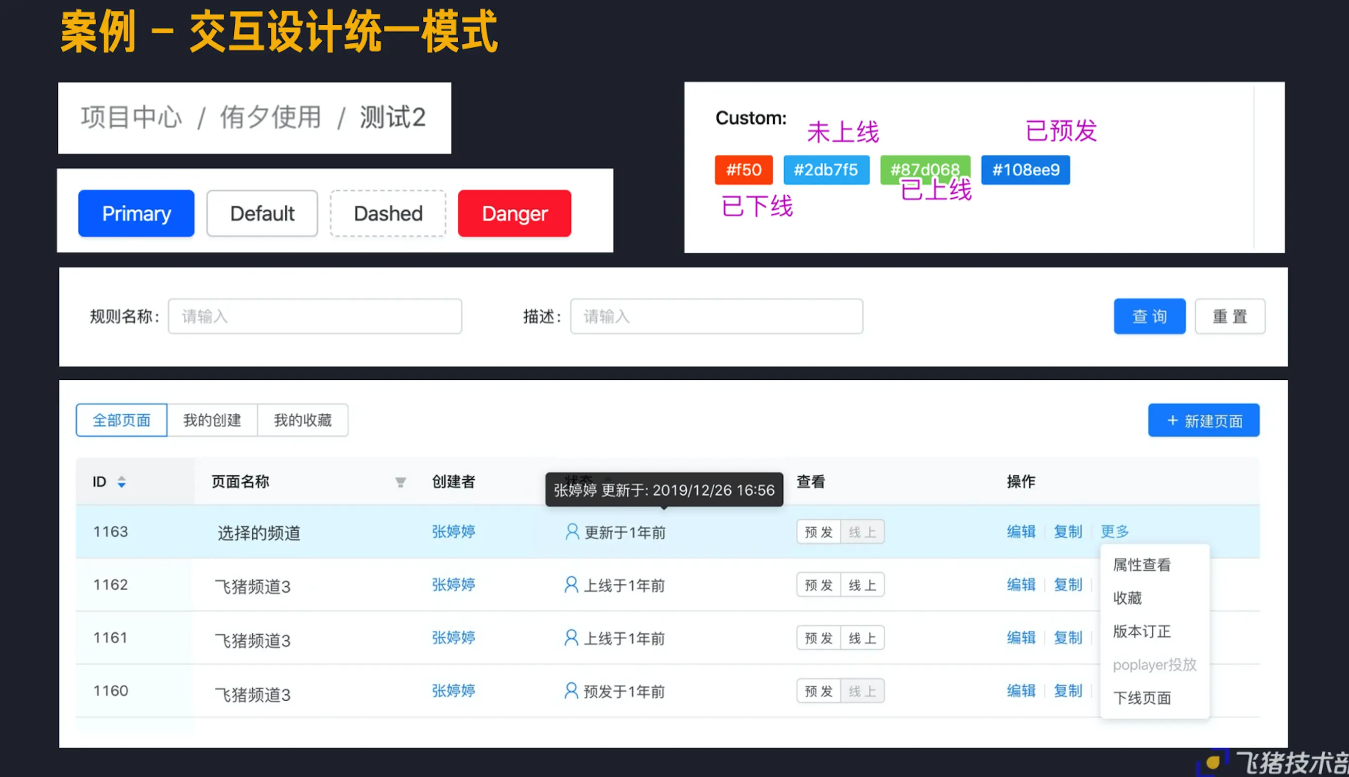 - 同类统一:不折腾,通用层面遵循 Ant Design;同类型 / 同功能模块展示保持一致