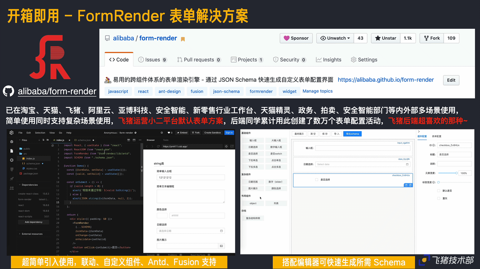 如FormRender的表单的沉淀,我们可以借此此能力可以生产大量的表单页面,同时展示完全让后端侧来控制展示,这样可以做到协议驱动展示,更多详细可见 alibaba/form-render