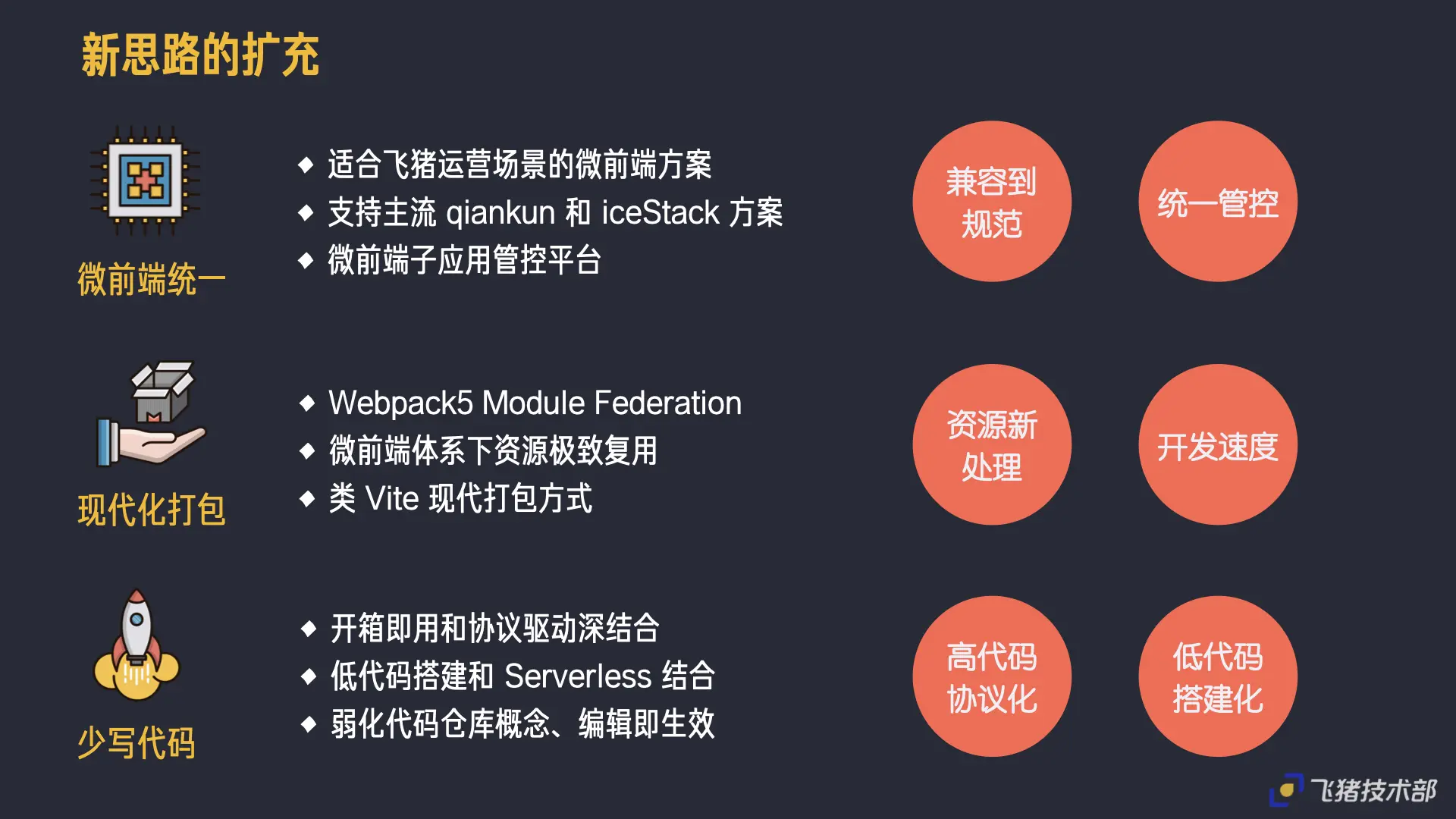 对于技术侧,将尝试更多的新技术探索,特别在微前端规范统一方面,如何让现有系统可以接入目前主流的微前端的子应用能力,包括上层子应用的管控平台;同时目前的新打包体系或许可以给我们很多新的思路来扩充现有的打包的能力;以及上述的开箱即用协议驱动的搭建如何通过低代码的搭建的方式来更多提升我们的快速生成的能力!