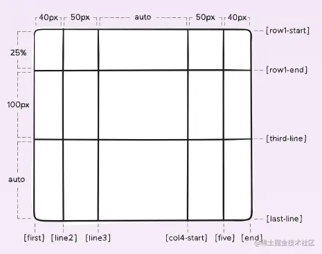 grid-template-rows: [row1-start] 25% [row1-end] 100px [third-line] auto [last-line];