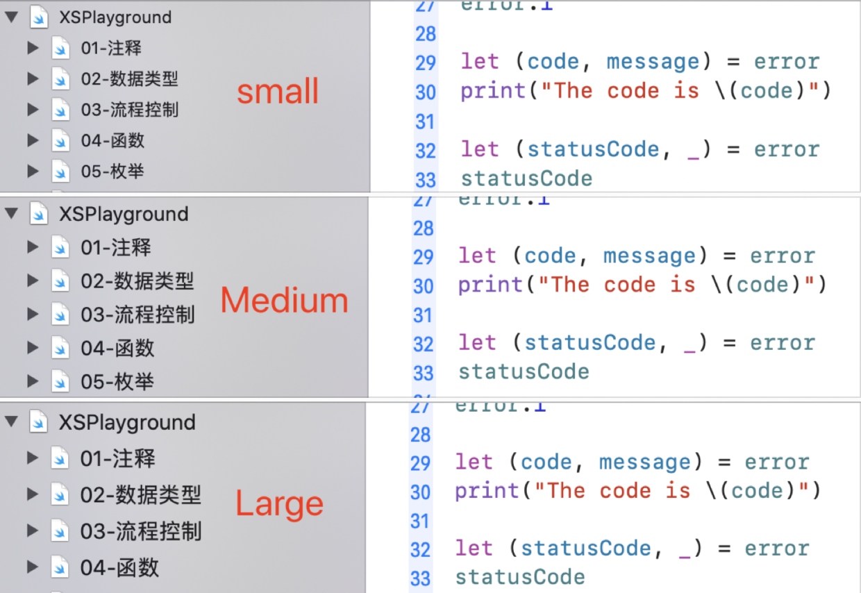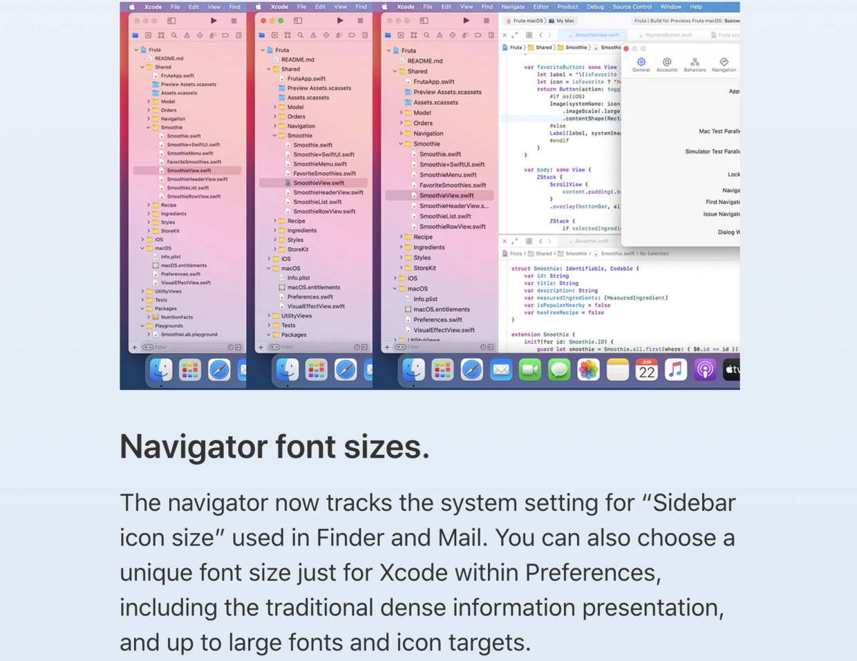 但现在,Xcode 12.0 beta 带来了这个让人“眼前一亮”的新功能。下图是Apple官网对调整导航目录字体大小功能的描述: