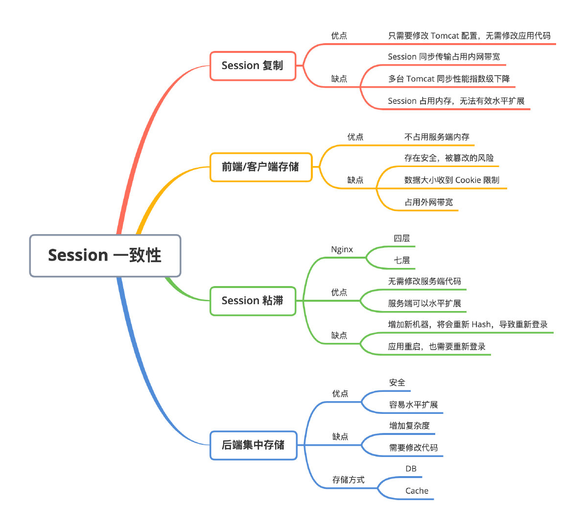 最后总结一下,当我们后端 Web 应用扩展到多台后,我们就会碰到分布式一致性 Session 的问题,主流解决方案有四种: