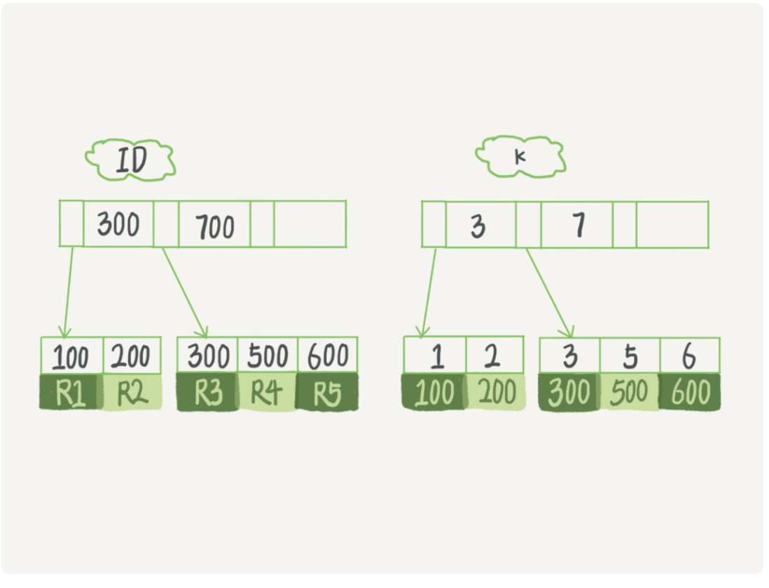 下图是主键索引和普通索引k,两个索引树的示意图。