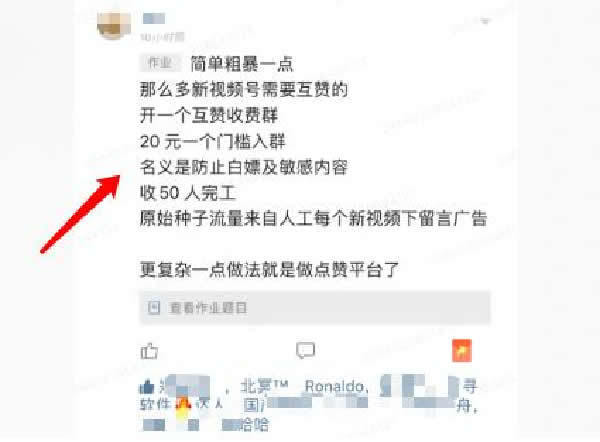 这个服务呢,上面说视频号推广,付费有点了一嘴。嗯,现在某些群或者星球都有人发现了这个商机。什么商机?就是视频号点赞,关注,评论这些来收费。我就随便截个图哈: