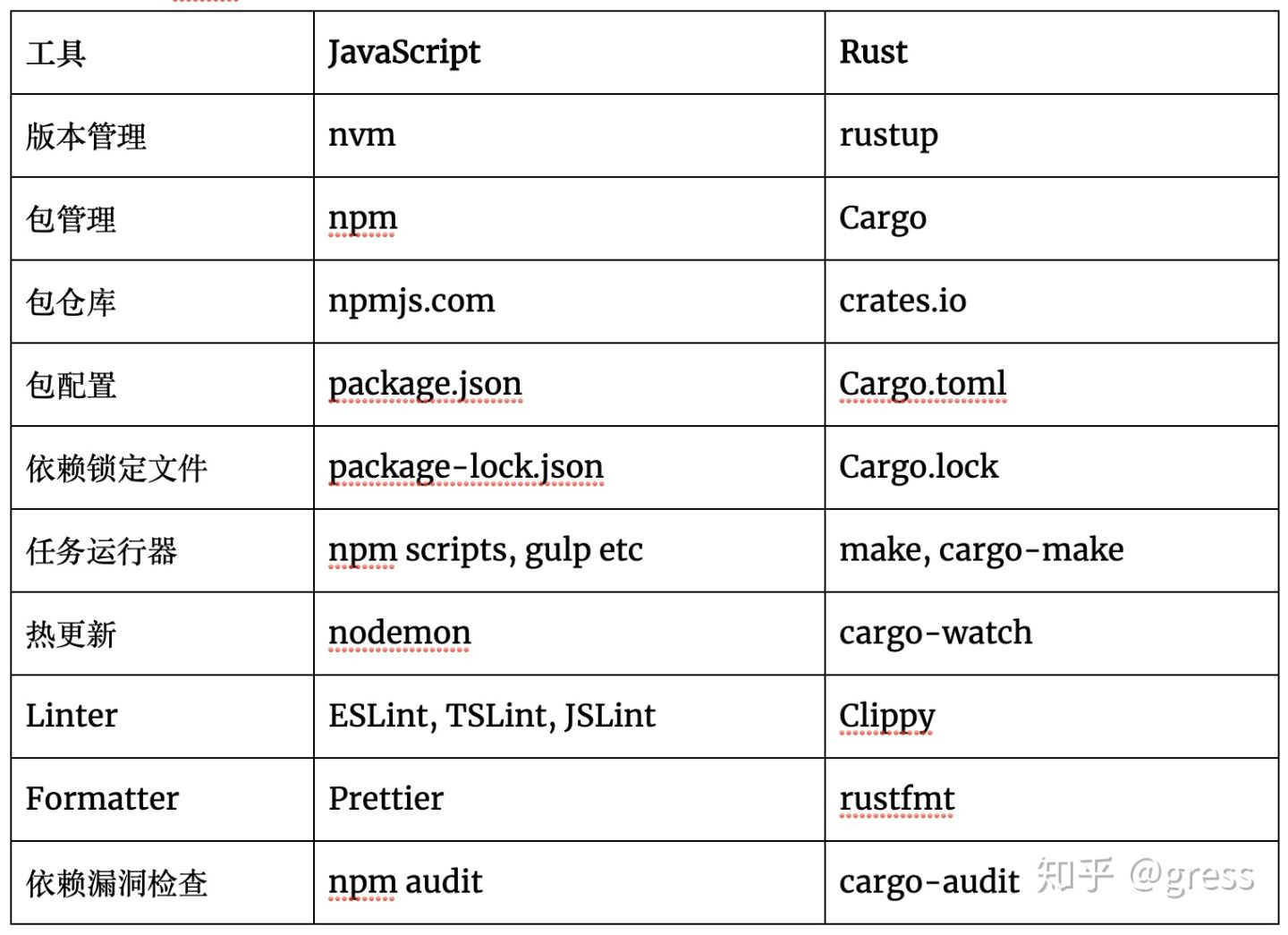 NPM 主要是用来做包管理, 也可以使用 npm scripts 功能来执行任务. Cargo 内置的通用任务包括执行代码,构建代码等等. Cargo 也有一些开箱即用的功能例如 workspaces (类似于 lerna)的功能, 依赖重载 (类似 patch-package), 也可以运行测试任务 (类似于 mocha, jest 等), 运行benchmark 等等.