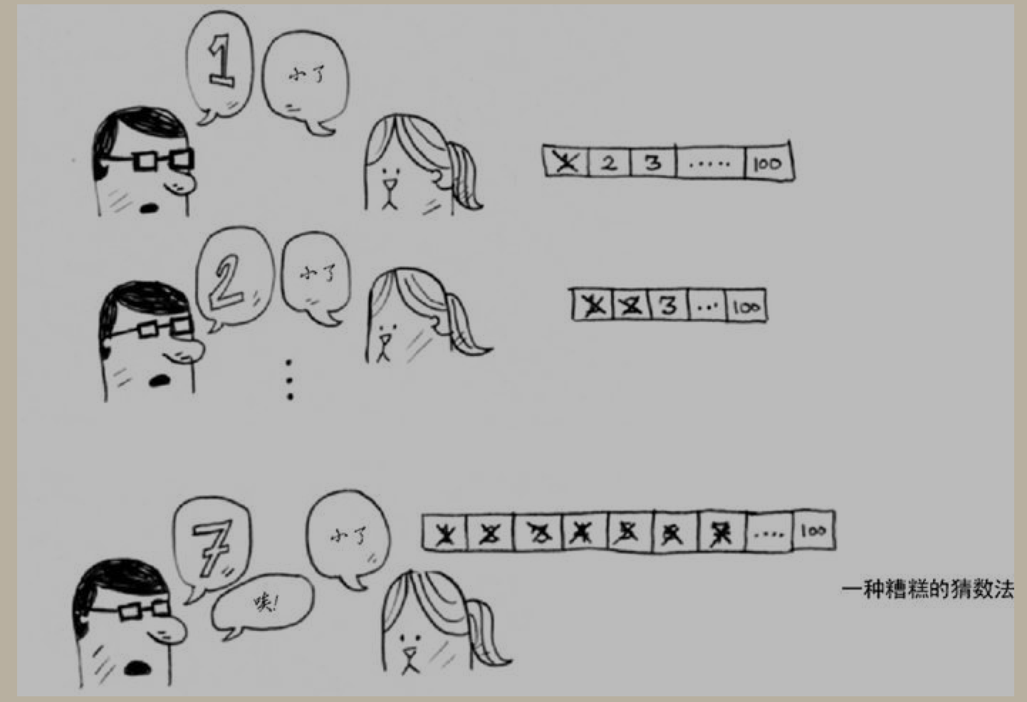 假设你从1开始查找,那你需要猜最多99次,才能猜对,这种是简单查找更确切的说是傻找。每次只能排除一个数字。