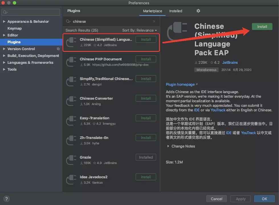 官方这次更新之后支持了汉化版,汉化需要借助JetBrains官方提供的Chinese (Simplified) Language Pack EAP插件。可通过安装插件进行汉化