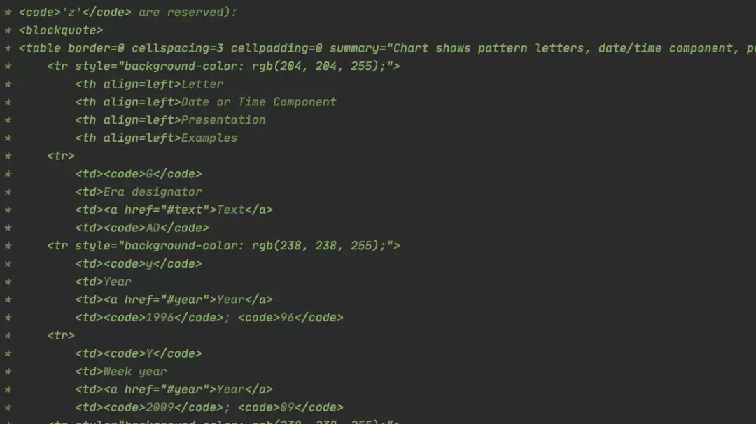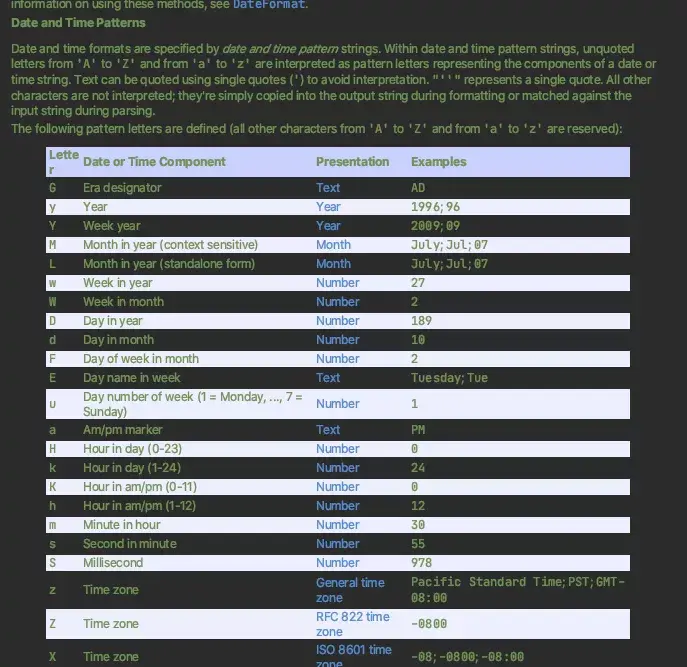 如下是SimpleDateFormat中javadoc的一部分,是不是给人一种无法读下去的感受。
