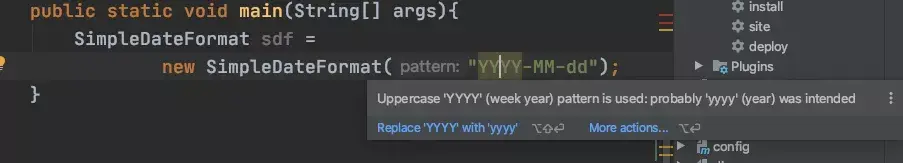 这里呢,IDEA就会在YYYY字符上进行高亮显示,鼠标放上去就会提示我们,点击下方的Replace ‘YYYY’ with ‘yyyy’ 会自动帮我们进行替换。