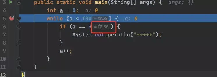 在第5行加了断点,当我们debug启动时,第6行就会进行与判断False。