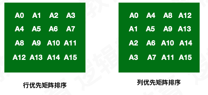 简单来说矩阵就是一个矩形的数字、符号或表达式数组。矩阵中每一项叫做矩阵的元素。 OpenGL中使用一维数组来表示一个矩阵(约定试用列优先矩阵)。 列向量进⾏了特别的标注:矩阵的最后⼀⾏都为0,只有最后⼀个元素为1。 在其他编程标准中, 许多矩阵库定义一个矩阵时,使⽤用二维数组;OpenGL的约定⾥里,更多倾向使用 一维数组; 这样做的原因是: OpenGL 使用的是 Column-Major(以列为主)矩阵排序的约定;