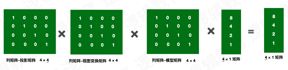 单元矩阵在 OpenGL 的维度,有以下公式: 变换顶点向量 = M_pro * M_view * M_model * V_local 变换顶点向量 = 投影矩阵 ✖ 视图变换矩阵 ✖ 模型矩阵 ✖ 顶点