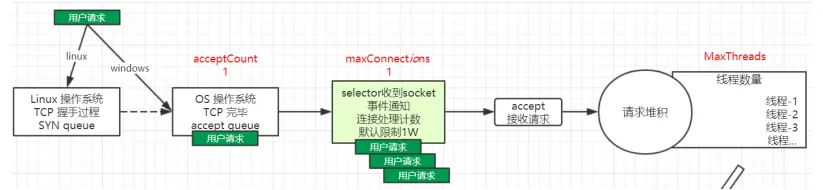 前面说到在linux系统中会有所不同,因为linux会在SYN队列堆积一些三次握手过程中的请求,所以它的受理请求应该是 (connections+acceptCount+SYN队列容量)