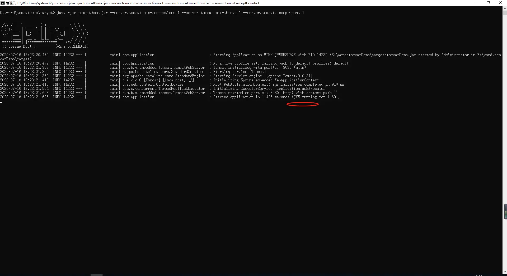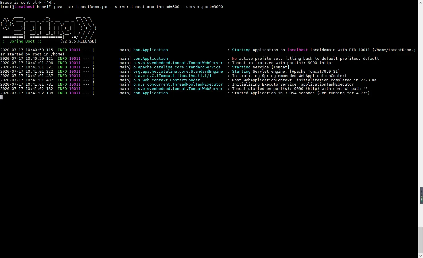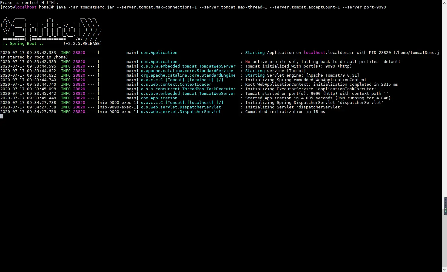 java -jar tomcatDemo.jar --server.tomcat.max-connections=1 --server.tomcat.max-thread=1 --server.tomcat.acceptCount=1 --server.port=9090