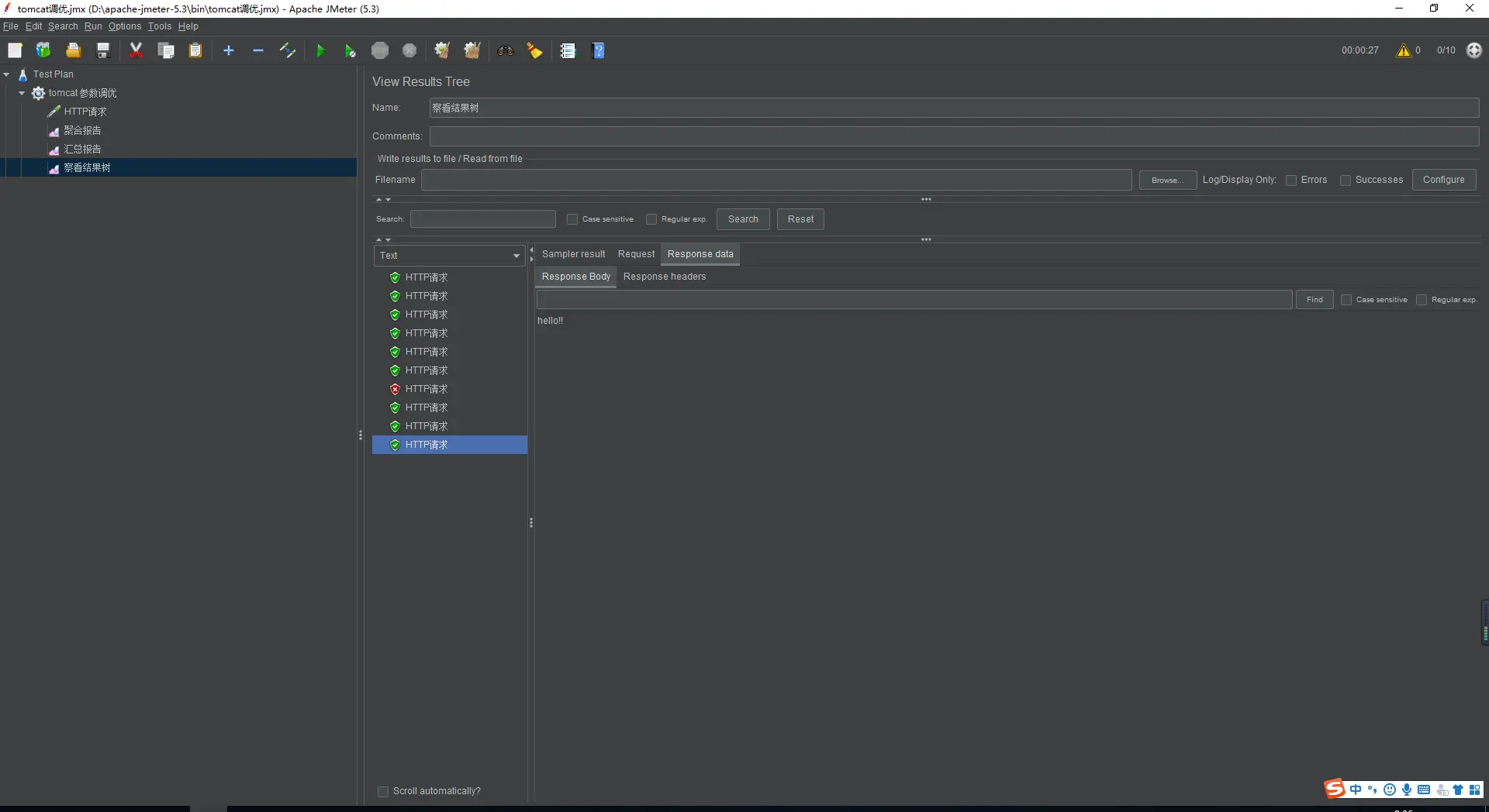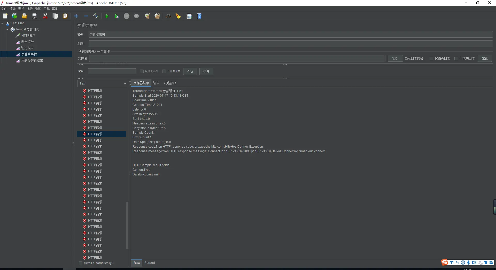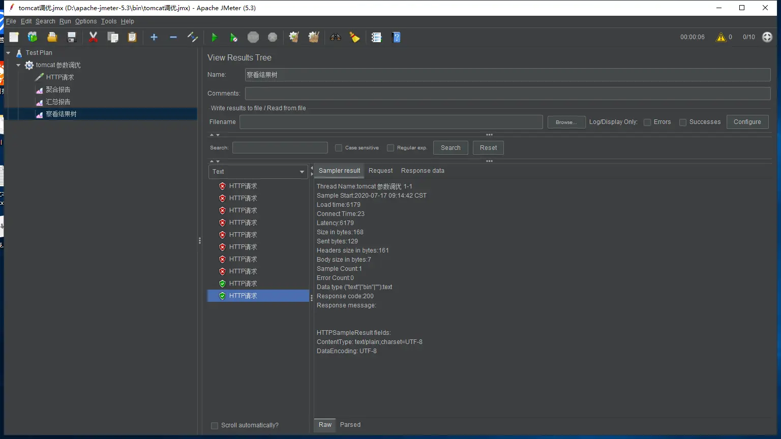 可以看到运行结果,在windows操作系统下 10请求只成功了2个,有8个被拒绝连接.因为connections和acceptCount都设置为1,所有只能处理2个请求