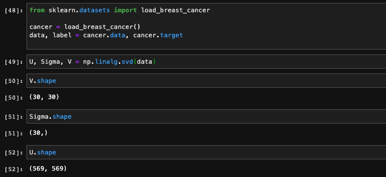 关于SVD算法我们并不需要自己实现,因为numpy当中封装了现成的SVD分解方法。