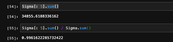 这里的Sigma返回的是一个向量,代替了对角矩阵,节省了存储开销。我们可以通过找出最小的K,使得K个奇异值占据整体奇异值95%以上的和。这里可以看到,我们选出了5个奇异值就占据所有奇异值和的99%以上: