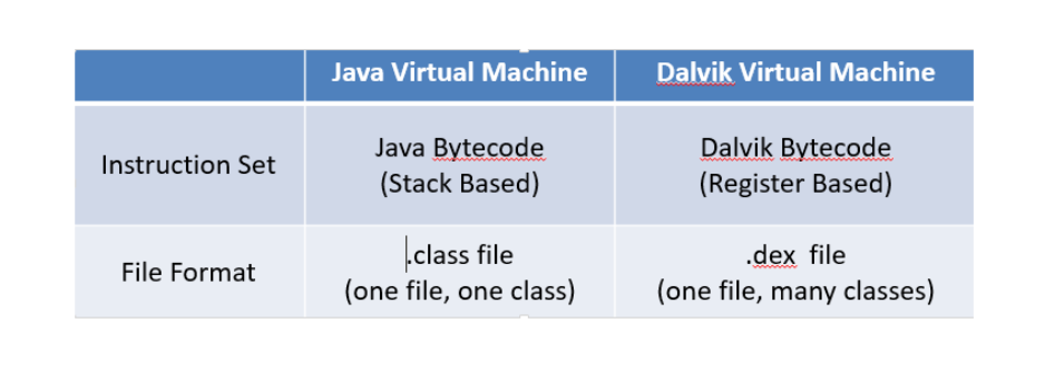 Dalvik 虚拟机与 Java 虚拟机有差不多的特性,差别在于两者执行的指令集是不一样的,前者的指令集是基于寄存器的,而后者的指令集是基于堆栈的。