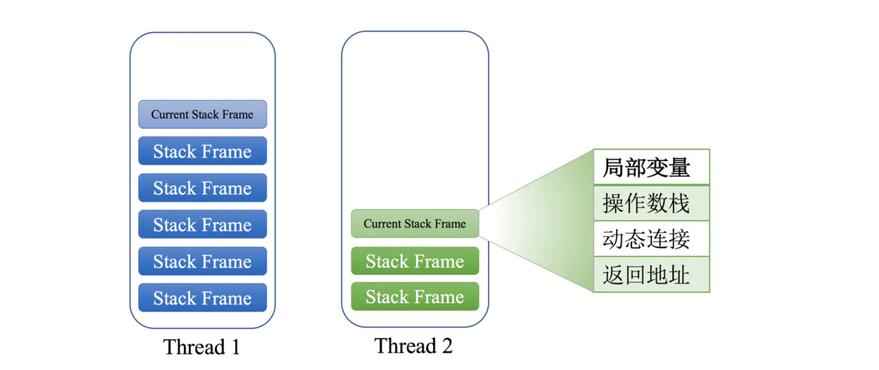 对于基于栈的虚拟机来说,每一个运行的线程,都有一个独立的栈。栈中记录了方法调用的历史,每有一次方法调用,栈中便会多一个栈帧。最顶部的栈帧称作当前栈帧,其代表着当前执行的方法,基于栈的虚拟机通过操作数栈进行所有操作。