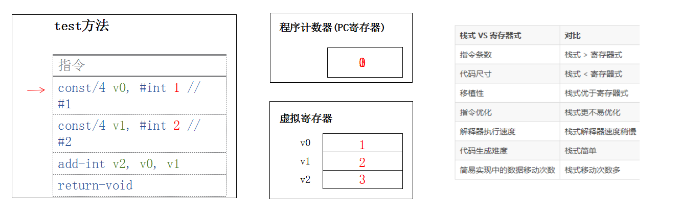 基于寄存器的虚拟机中没有操作数栈,但有很多虚拟寄存器。其实和操作数栈相同,这些寄存器也存放在运行时栈中,本质上就是一个数组。与 JVM 相比,在 Dalvik VM 中每个线程都有自己的 PC和调用栈,方法调用的活动记录以帧为单位保存在调用栈上。