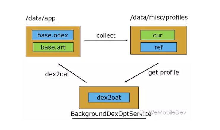 AOT编译(安装快了),运行过程中解释执行,对经常执行的方法JIT,经过JIT编译的方法将会记录到Profile配置文件中。 - 当设备闲置和充电时,编译守护进程会运行,根据
