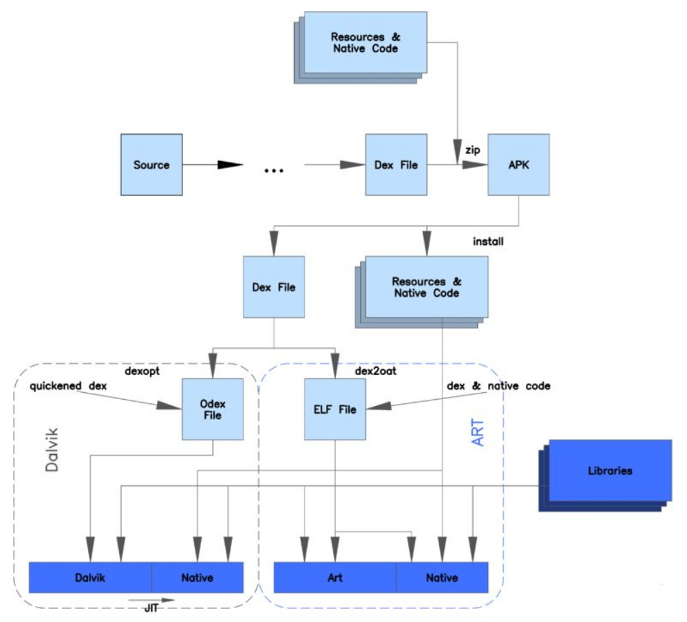 而 ART(Android RunTime) 是在Android 4.4中引入的一个开发者选项,也是 Android 5.0 以及更高版本的默认Android运行时。ART 虚拟机执行的是本地机器码。Android 的运行时从 Dalvik虚拟机替换成 ART虚拟机,并不要求开发者将自己的应用直接编译成目标机器码,APK 仍然是一个包含 dex 字节码的文件。