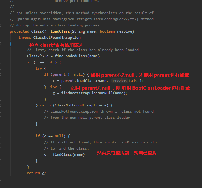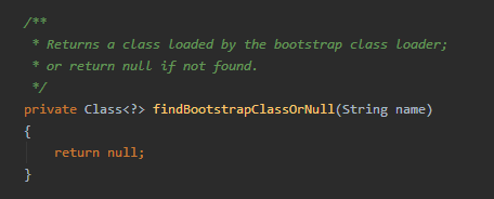 值得注意的是:c = findBootstrapClassOrNull(name); 按照方法名理解,应当是 parent 为 null 的时候,也能够加载 BootClassLoader 加载的类。
