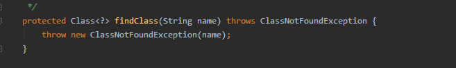 可以看到在所以 ClassLoader 都无法加载 class 时,则会调用自己的 findClass 方法。 findClass 在 ClassLoader 中的定义为: