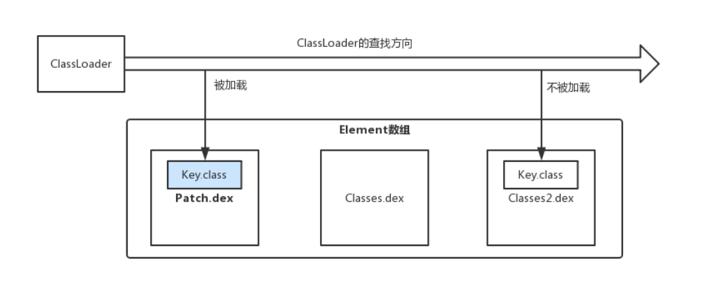 在 PathClassLoader 中的数组为:[Patch.dex, classes.dex , classes2.dex]。如果存在 Key.class 位于 patch.dex与 classes2.dex 中都存在一份,当进行类查找时,循环获得 dexElements 中的 dexFile,查找到了 Key.class 则立即返回,不会再管后续的 Element 中的 DexFile 是否能加载到 Key.class 了。