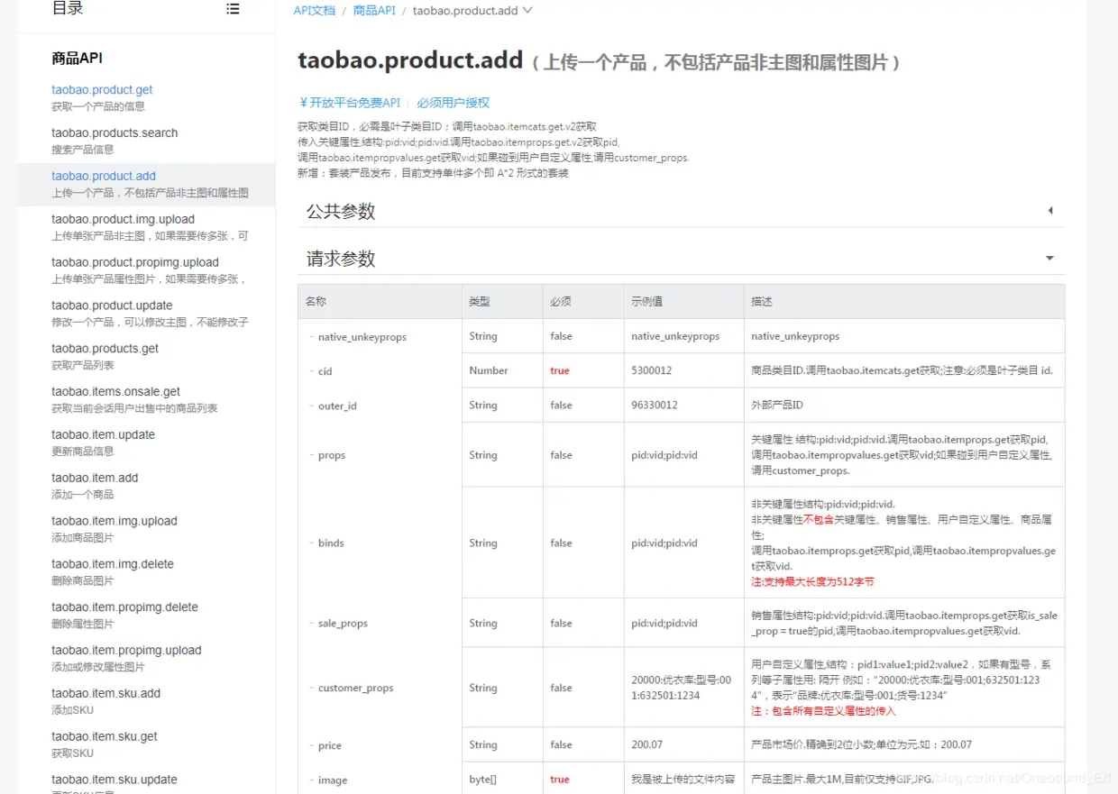 taobao.item.update 更新商品信息 【测试成功】 taobao.item.add 添加一个商品 【测试成功】 taobao.item.img.upload 添加商品图片 【测试成功】 taobao.item.img.delete 删除商品图片 【测试成功】 taobao.item.propimg.delete 删除属性图片【测试成功】 taobao.item.propimg.upload 添加或修改属性图片【测试成功】 taobao.item.delete 删除单条商品 【测试成功】 taobao.items.custom.get 根据外部ID取商品【*不明白什么是外部ID】 taobao.item.price.update 更新商品价格 【*使用替代接口】 taobao.miniapp.items.get 批量获取商品信息 【*使用替代接口】 taobao.item.seller.get 获取单个商品详细信息 【测试成功】 淘宝类目属性获取(规则获取) taobao.itemcats.authorize.get(授权类目和品牌) taobao.itemcats.get(可供发布的类目) taobao.itemprops.get( 获取标准商品类目属性 ) taobao.itempropvalues.get( 获取标准类目属性值 )