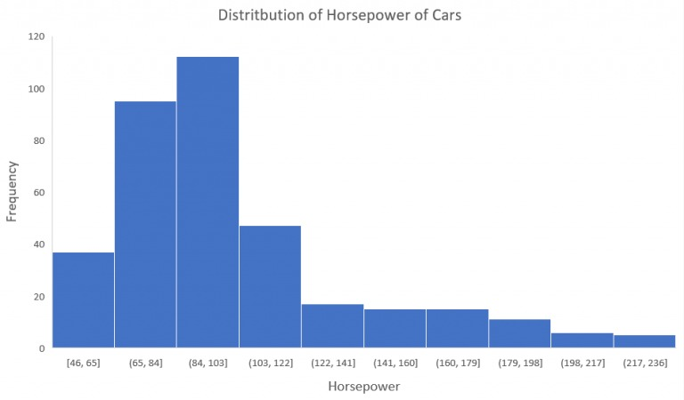 其次,让我们看看下面的分布。它是汽车的马力分布:
