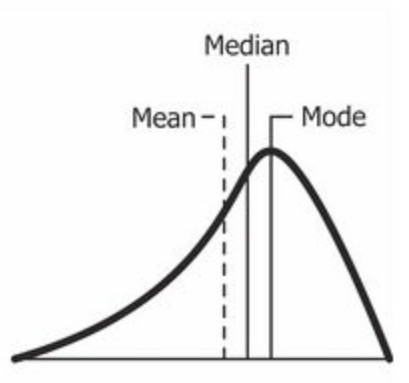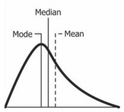 好吧,答案是,分布的尾巴在右边;它导致平均值大于中值,平均值最终向右移动。此外,众数出现在分布的最高频率,即中位数的左侧。因此,众数<中位数<平均值。