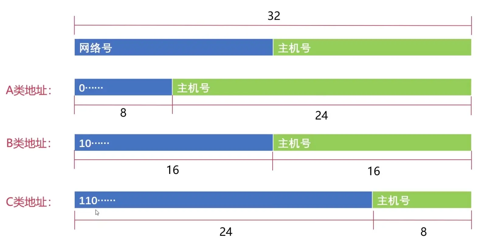 将一个IP地址分为两个部分,分别是「网络号」和「主机号」。这两部分加起来是32位。根据网络号和主机号长度的不同,又可以将IP地址分为以下几类: