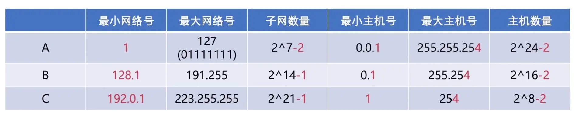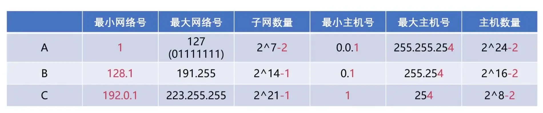 知道了每一类的IP地址网络号和主机号的位数,就可以计算出最小网络号、最大网络号以及最小主机号和最大主机号。但是这里边有一些「特殊的主机号」是需要排除的