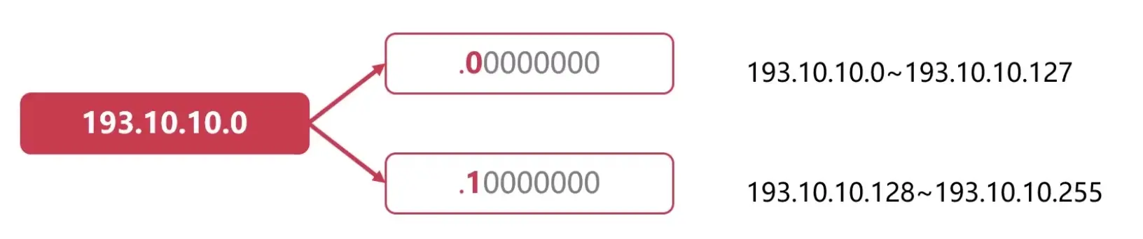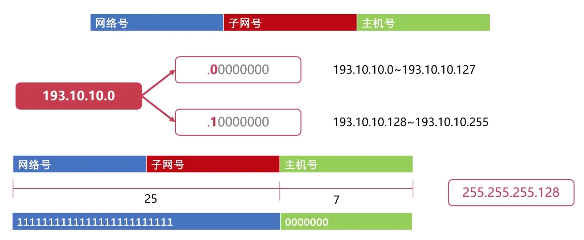 假设在上边的例子中,分配了C类地址193.10.10.0,对于这个C类地址有254个主机号。如果对这个C类地址进行子网划分的话,就可以把「第25位」看做是子网号(11000001.00001010.00001010.「0」0000000),那么就可以分成1和0这两个子网号。那么0这个子网号就可以表示:193.10.10.0 ~ 193.10.10.127这个网络段。1这个子网就可以表示:193.10.10.128 ~ 193.10.10.255这个网络段,这样就把原来的C类地址分成了两个子网
