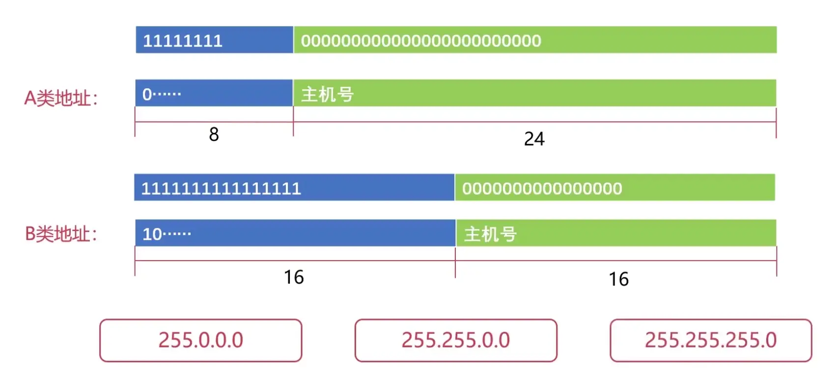 比如,对于A类地址,它的网络号有8位,主机号24位,那么对于A类地址,它的子网掩码就是由8个1和24个0所组成,也就是「255.0.0.0」。同理,B类地址的子网掩码就是由16个1和16个0所组成,也就是「255.255.0.0」