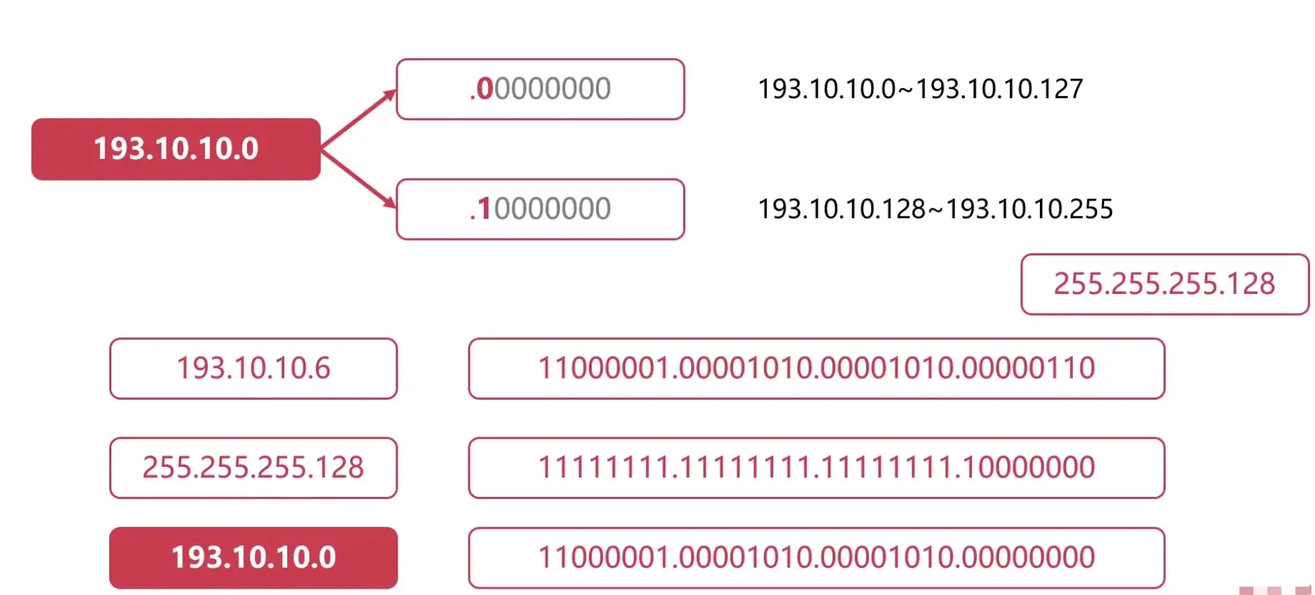 假设有193.10.10.6这个IP,首先可以知道它的子网掩码为255.255.255.128,然后将他们的二进制都表示出来,将他们的每一位进行“与”运算,会得到如下结果