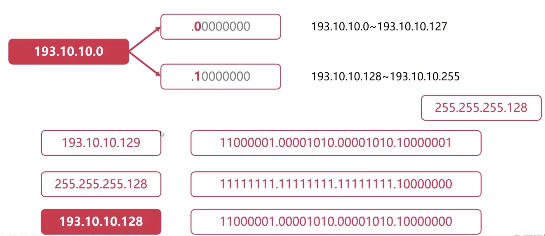 再假设有193.10.10.129这个IP,它的子网掩码为255.255.255.128,然后将他们的二进制都表示出来,将他们的每一位进行“与”运算,会得到如下结果