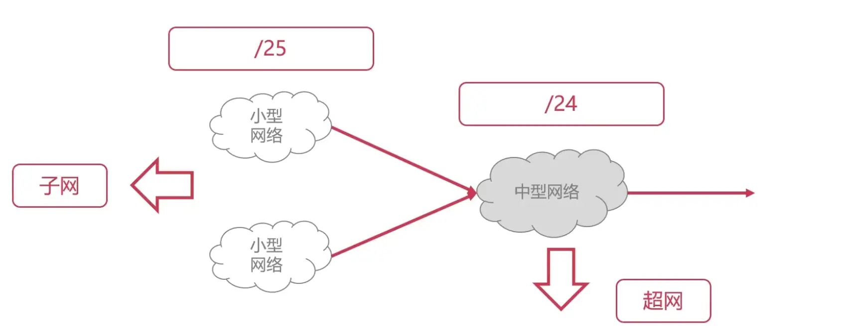 这个时候其实可以为他们分配一个24位网络前缀的IP地址,然后对于每一个部门都分配25位网络前缀的IP地址。这里就有小型网络和大型网络的概念了,在CIDR中,小型网络通常称为「子网」,对于那个网络前缀为24位的,在CIRDR中,称为「超网」