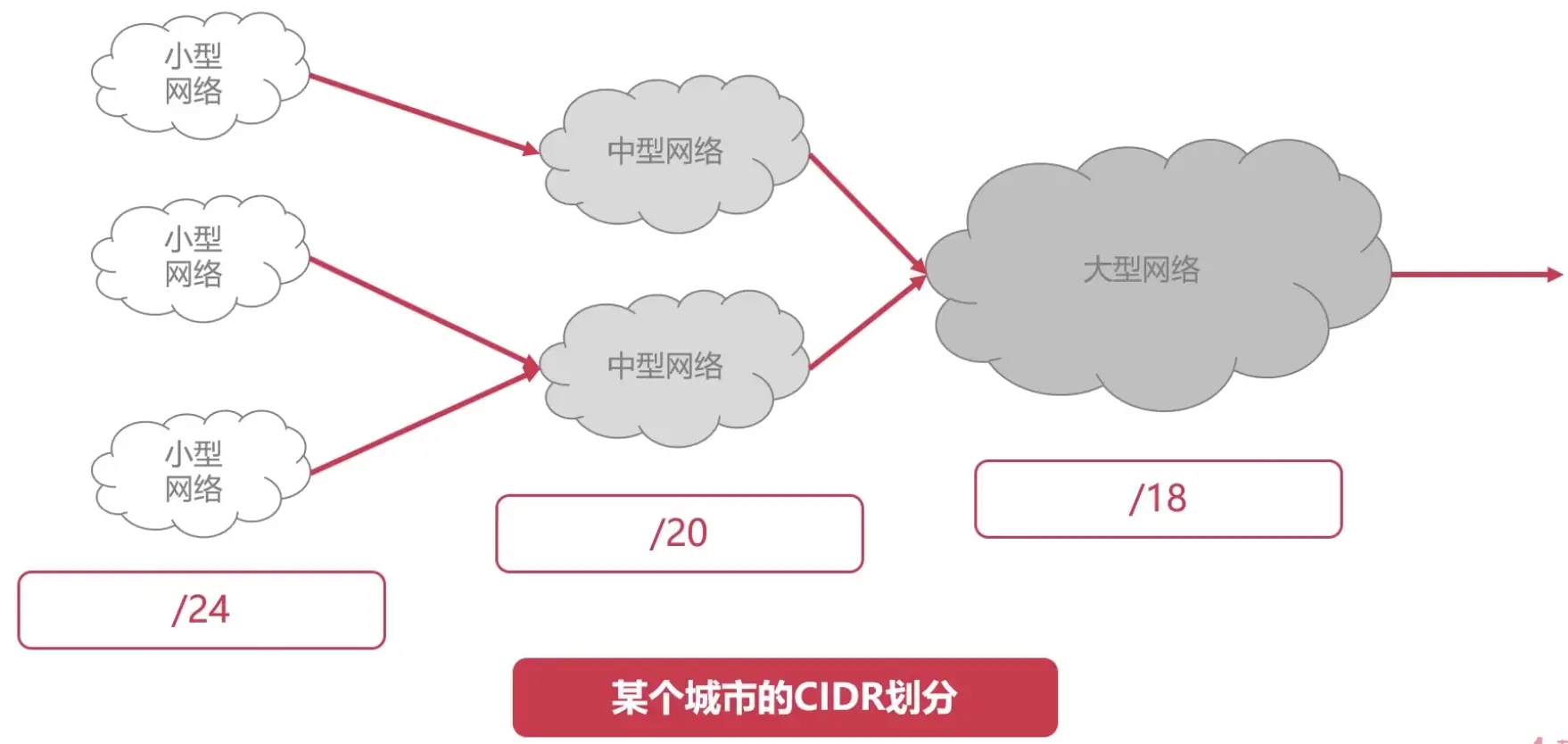 如果将该例子拓展一下,拓展为某一个城市。如果对一个城市,使用CIDR进行网络规划,可能给这个城市分配网络前缀为18的网络地址,给该城市中的公司分配网络前缀为20的网络地址,对于公司部门,则分配网络前缀为24的网络地址