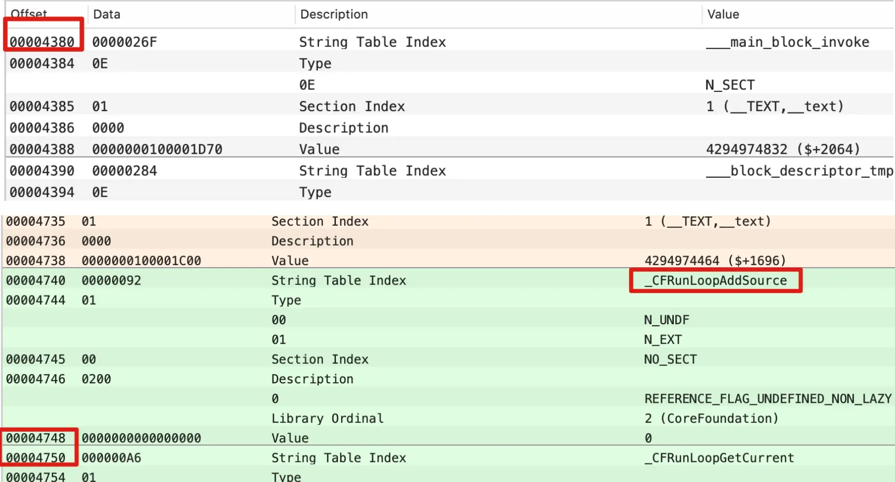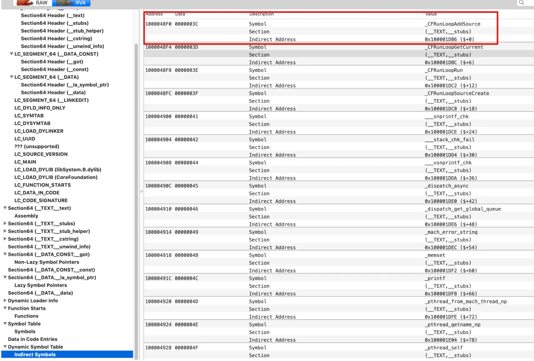 其内容为0x3c=60,对应的就是符号表第60个符号,通过符号表中的起始地址0x4380,每个符号占用0x10,则0x4740=0x4380+0x10*0x3c,对应的就是_CFRunLoopAddSource符号地址。