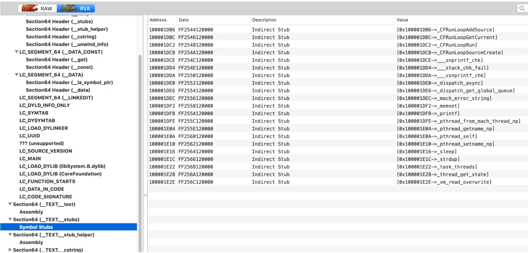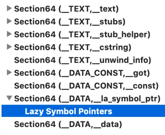 用于 Stub 的占位代码,很多地方称之为桩代码,用于重定向到 lazy 和 non-lazy 符号的 section,被标记为 S_SYMBOL_STUBS。TEXT Segment 里代码和 dylib 外部符号的引用地址对函数符号的引用都指向了 stubs。其中每项都是 jmp 代码间接寻址,可跳到la_symbol_ptr Section 中。 |