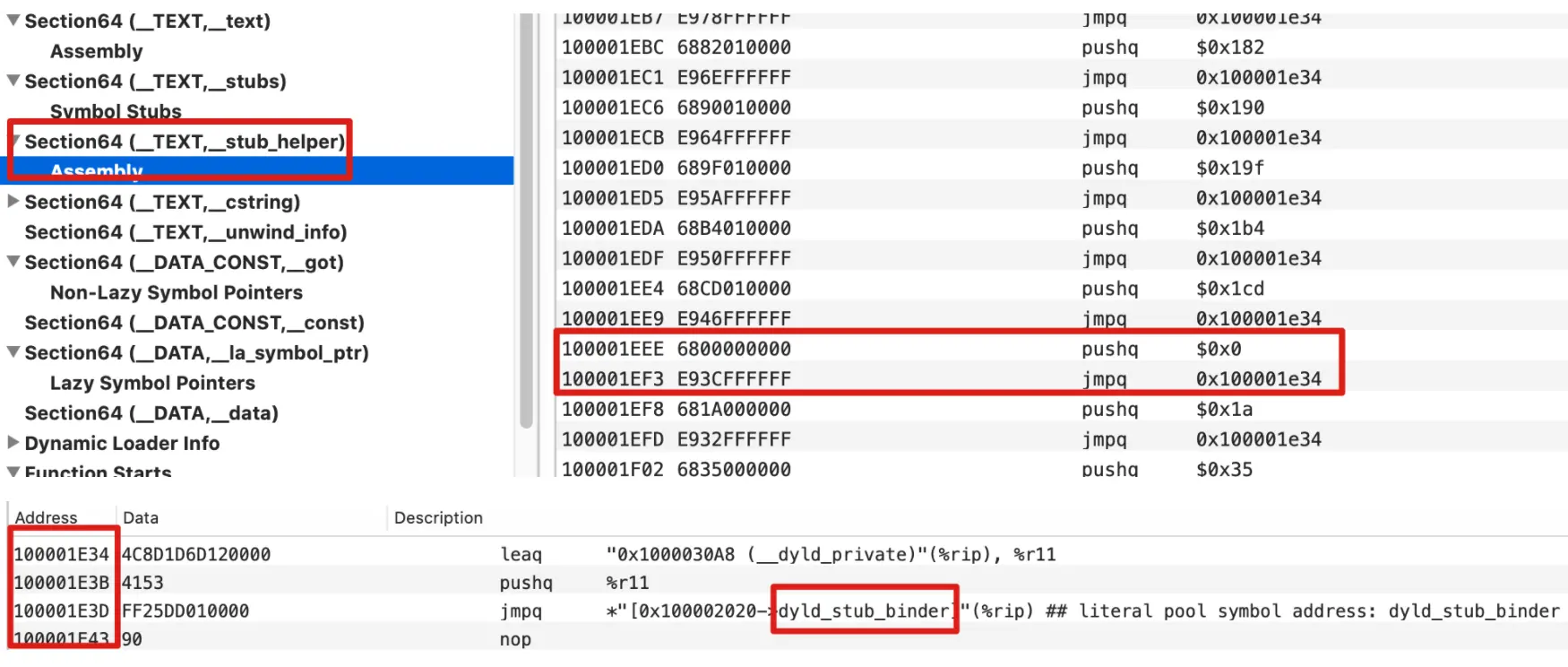 其实际内容都指向了_TEXT.__stub_helper节,最终通过jumpq指令跳转到了dyld_stub_binder符号,即__got节中的Non_Lazy Symbol Pointer中的条目,该符号为一个函数,定义于dyld_stub_binder.S,由 dyld 提供。