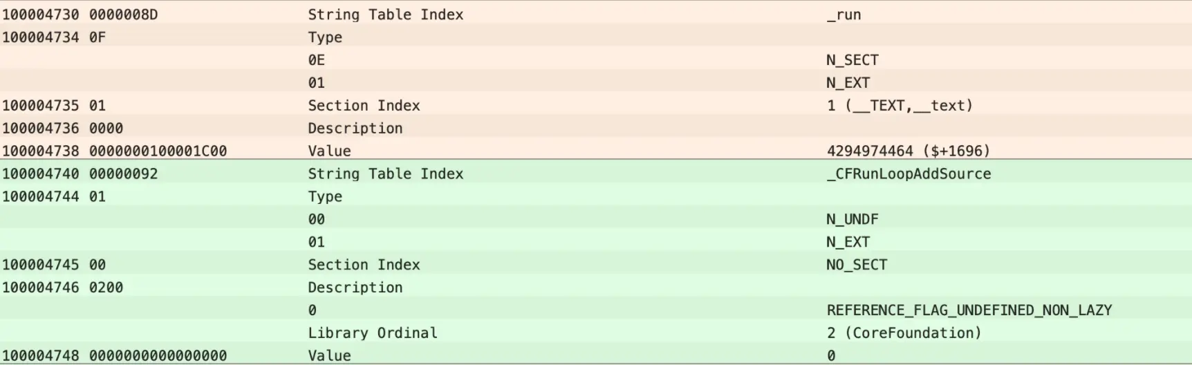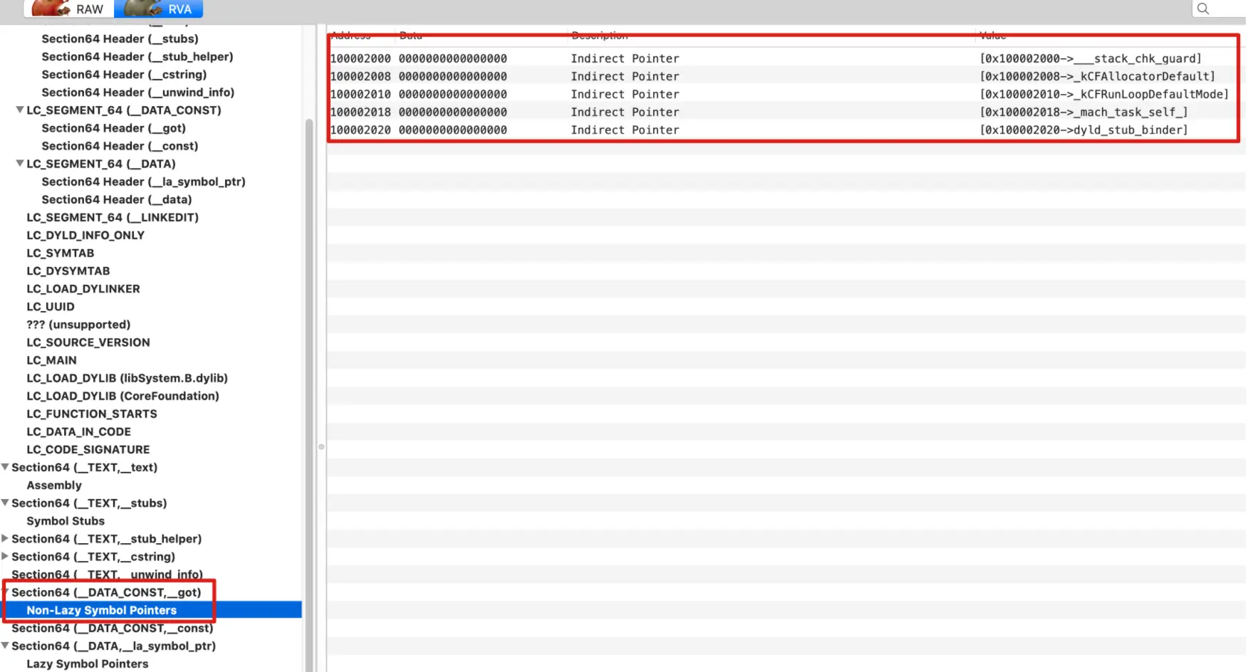 其类似一个表,每个条目是一个地址值,定义的是Non-Lazy Symbol Pointers即非懒加载符号地址,所有条目的内容都是0。其引入的目的是解决程序在链接阶段存放不能确定目的地址的符号,当镜像被加载时,动态链接器dyld会对每个条目对应的符号进行重定位,将其真正的地址写入,作为条目的内容。对于dyld如何确定符号信息的,可以通过上面的Indirect Symbol Table中的符号看出,包含了符号名称、间接符号地址。